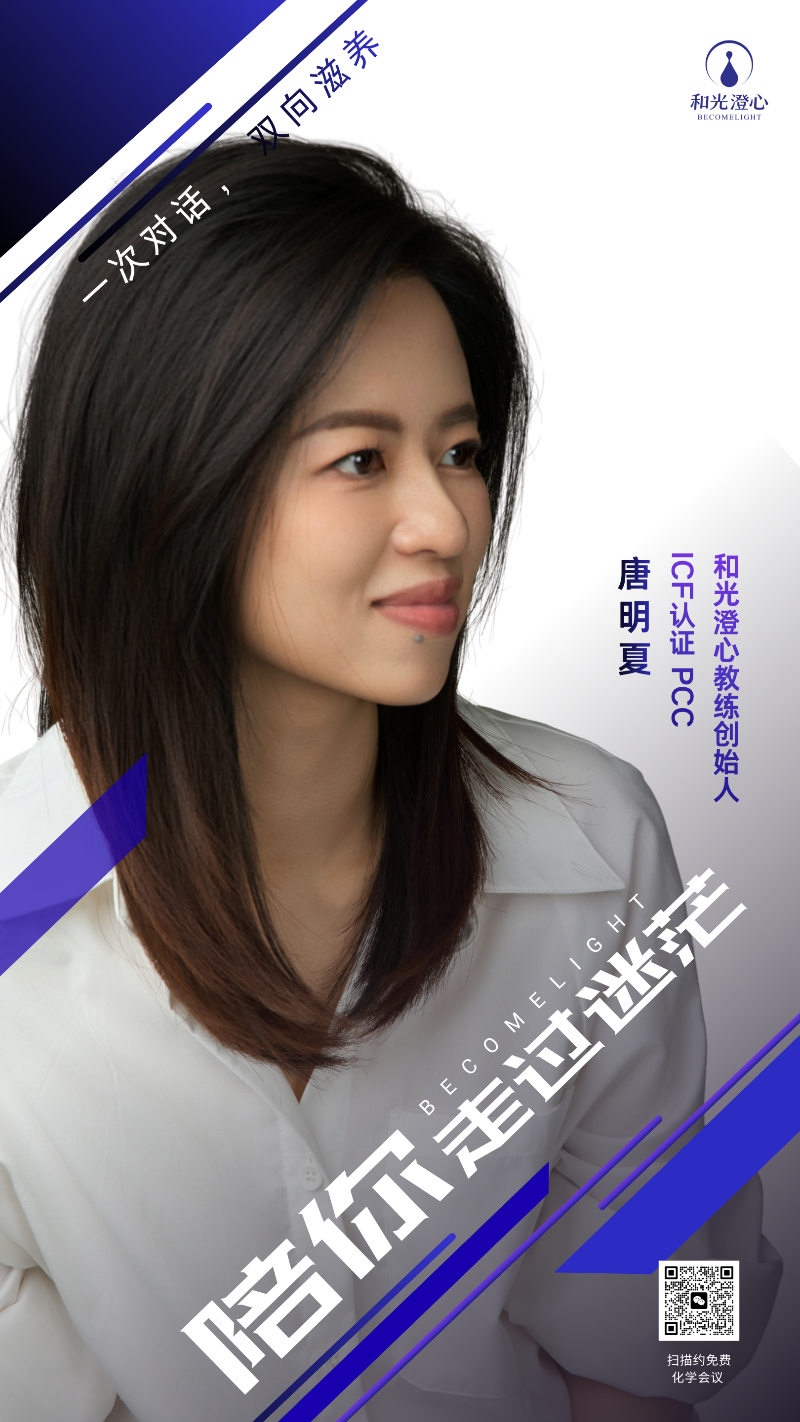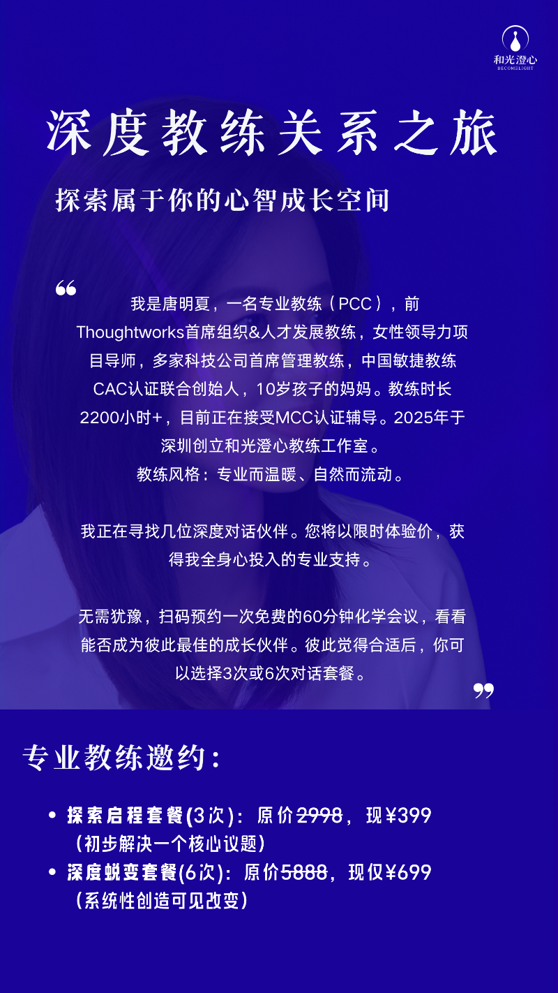 我是唐明夏(Marila),和光澄心教练创始人,一名专业教练 PCC。前Thoughtworks首席组织&人才发展教练,女性领导力项目导师,中国敏捷教练CAC认证联合创始人。和光澄心教练的愿景是:在AI原生的世界,做人心的守护者,激发属于你的光芒。
